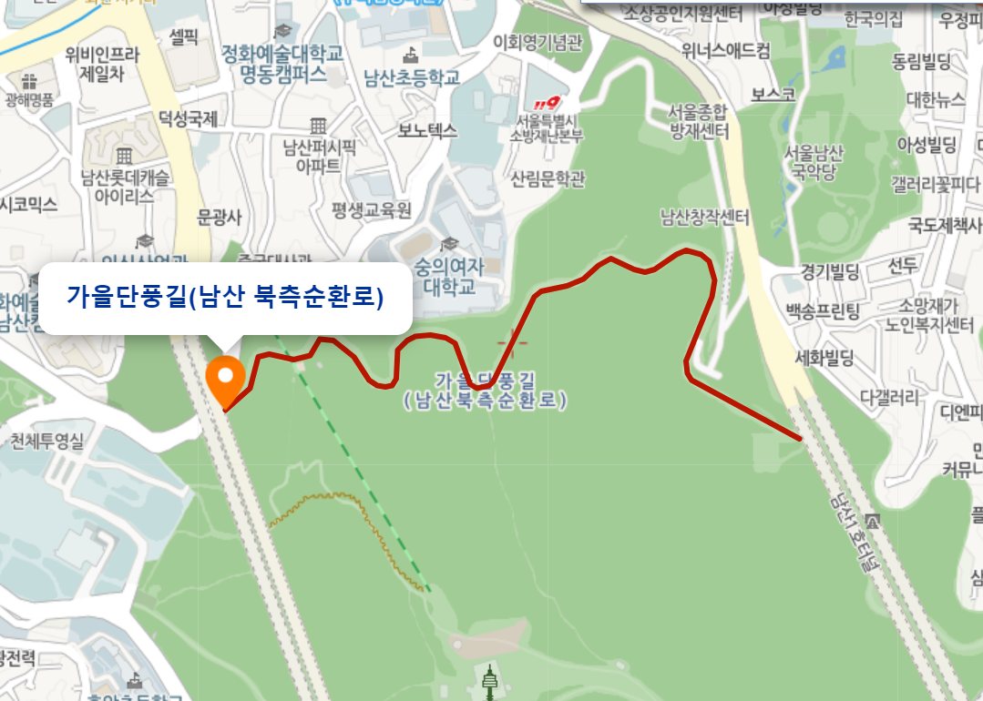 서울을 대표하는 랜드마크 남산타워가 있는 남산 둘레길은 가을 단풍을 맞이하기 좋은 장소 중 하나입니다. 남산 둘레길 전체가 아름다운 단풍 명소이지만 이 중 남산남측순환로는 가을 단풍길이라 이름이 붙혀진 장소입니다. 울긋불긋 단풍을 따라 연인과 함께 산책하며 가을 추억을 만드시면 좋을 것 같습니다. 남산남측순환로 근처로는 명동이 가까이 있어 명동에서 데이트를 이어가시면 좋을 것 같습니다.